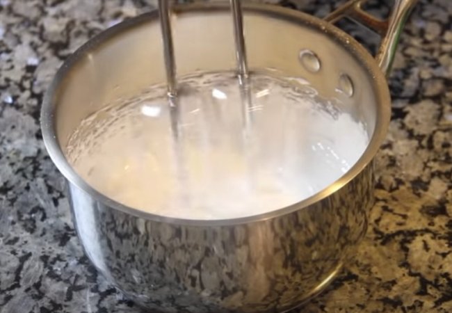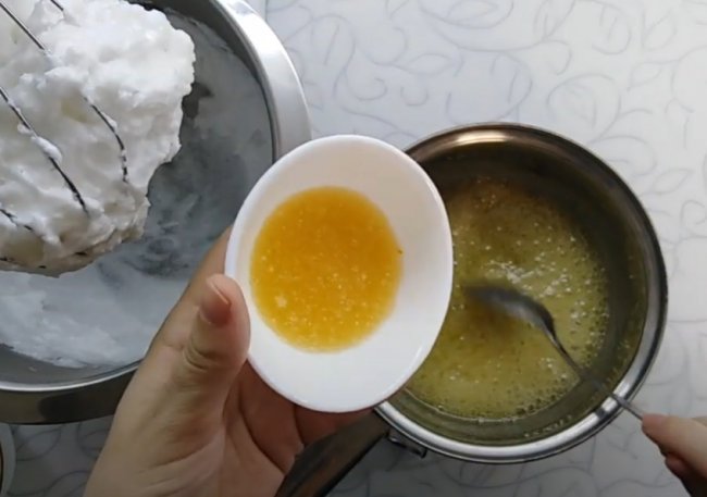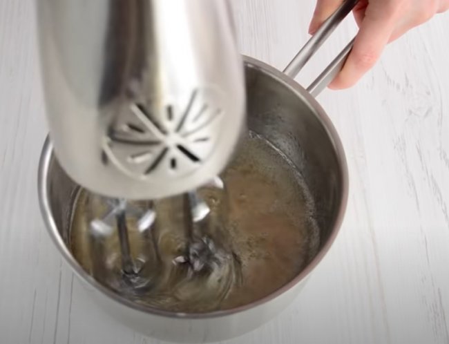 - Теперь сироп остужаем до комнатной температуры и взбиваем миксером до нужной консистенции. Чем дольше его взбивать, тем более густым он становится.