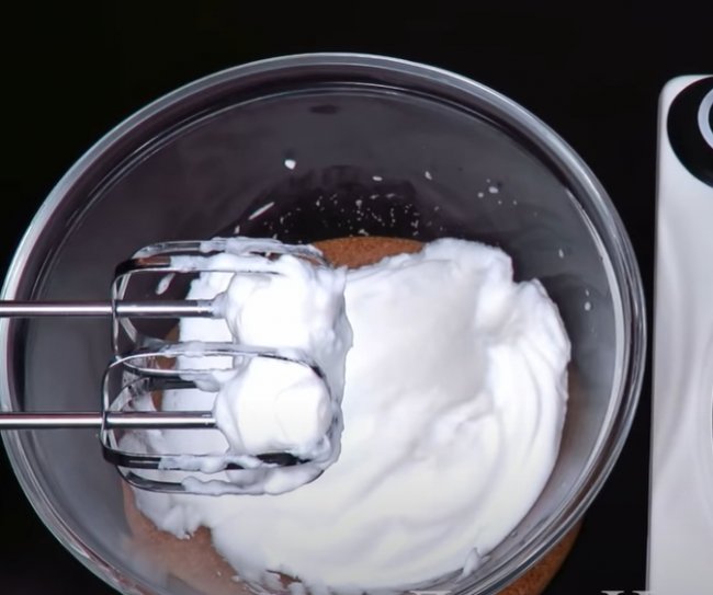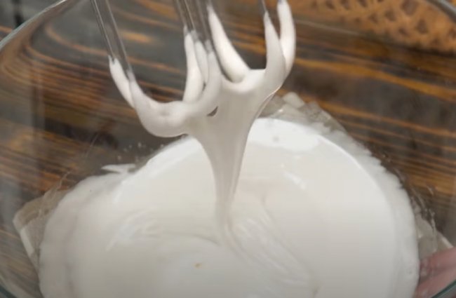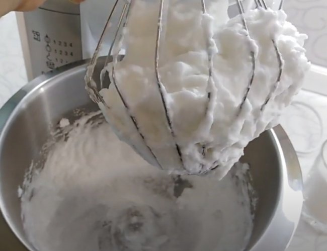 - Взбиваем яичные белки в течение 5 минут — они должны стать плотными и не спадать с венчика.