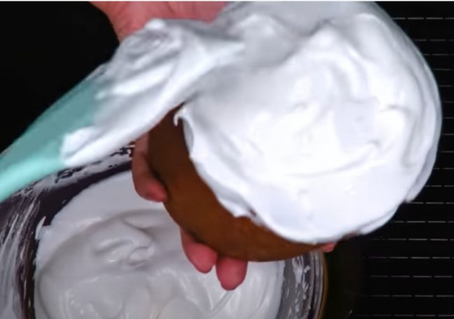 - Переливаем сироп в чашу и взбиваем до пышной массы. Если нужно, чтобы глазурь ложилась с потеками, то взбиваем 3 минуты, а если нужна более плотная, то еще на 2 минуты дольше.