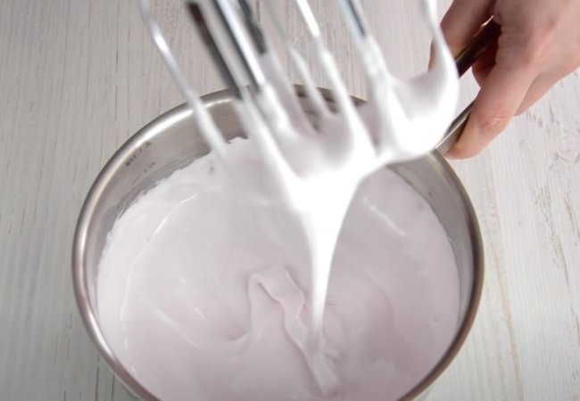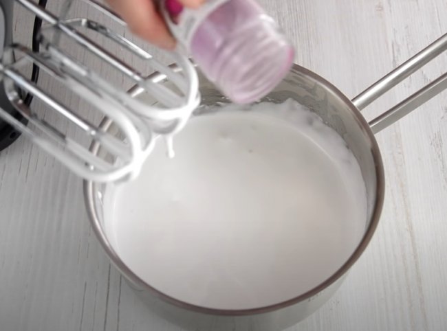 - Возвращаемся к взбитым белкам, включаем миксер и тонкой струйкой вливаем сироп. Взбиваем глазурь в течение 3 минут, но если нужно, чтобы она получилась более густой, то 5 минут.