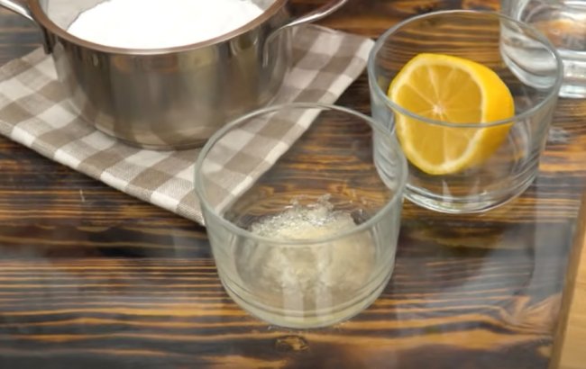 - Варим сироп. Для этого в сотейнике соединяем сахарную пудру с водой и лимонным соком. Ставим на малый огонь.