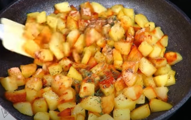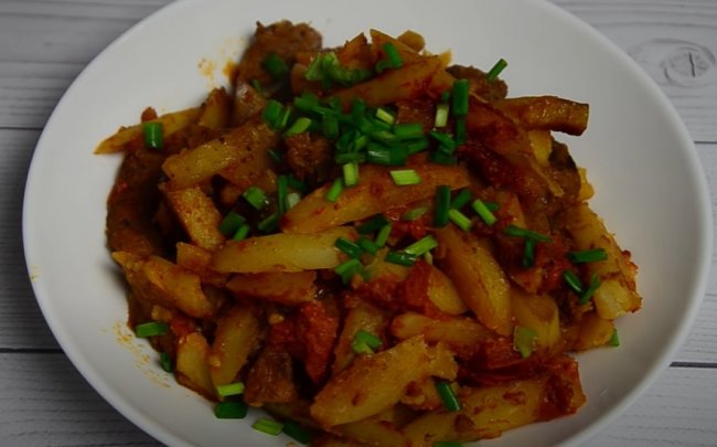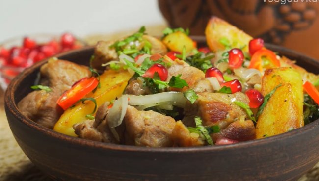 Из простых продуктов быстро и вкусно можно приготовить на ужин то, что очень любят делать на ужин в Грузии. Жареные кусочки свинины и картофеля со специями и травами – очень аппетитно и вкусно.