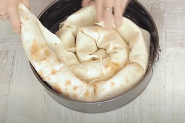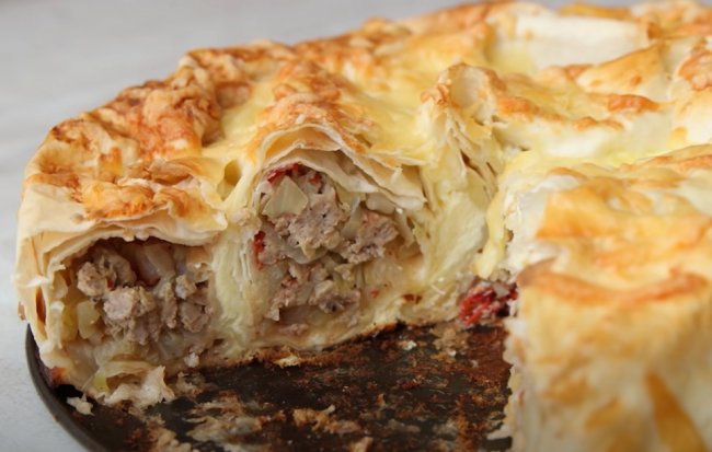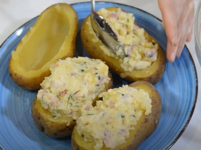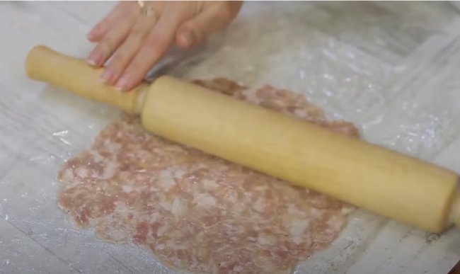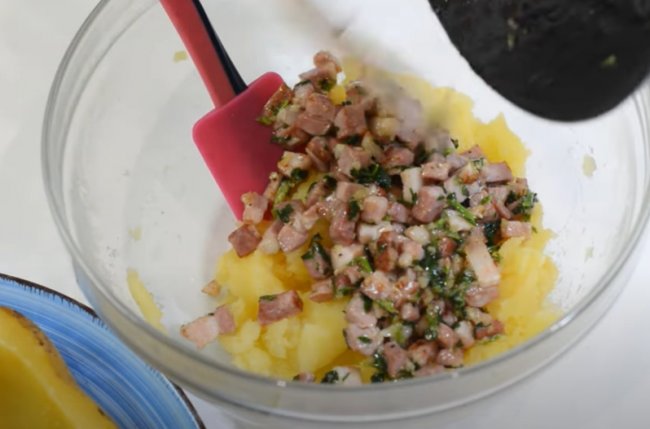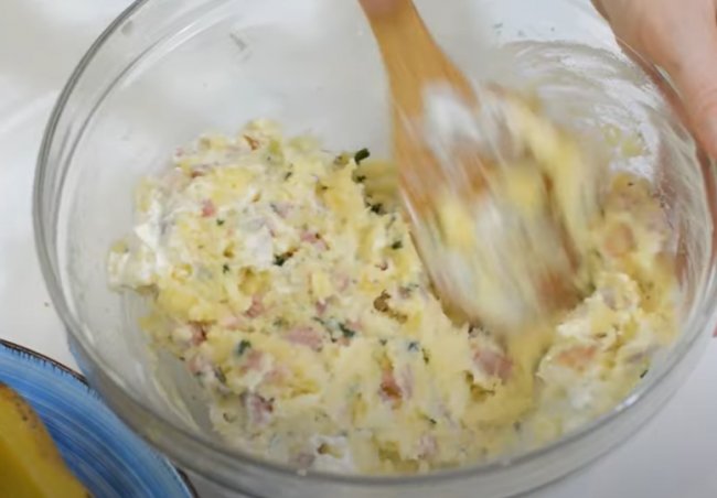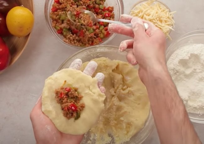 - Теперь из пюре делаем лепешку, в середину кладем начинку из фарша и сладкого перца, посыпаем тертым сыром и защипываем края. Придаем заготовке овальную форму.
