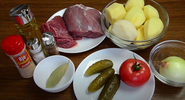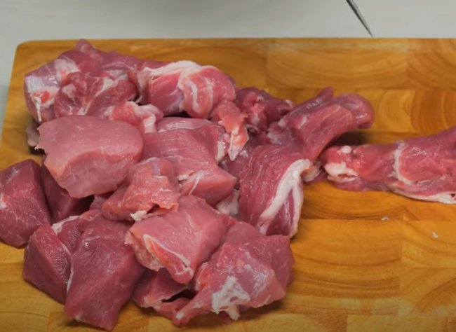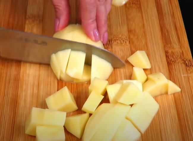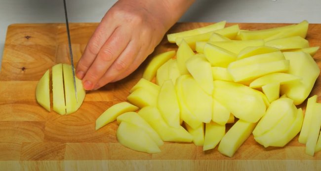 - Свинину режем небольшими кусочками, брусочками средней величины нарезаем картофель.