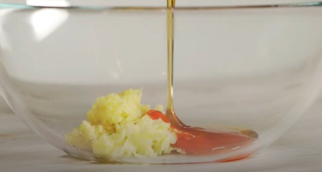 - В мисочке соединяем измельченный чеснок и свежий имбирь, острый соус, черный перец. Также вливаем мед, соевый соус, все тщательно размешиваем.