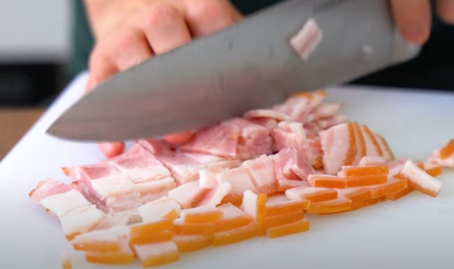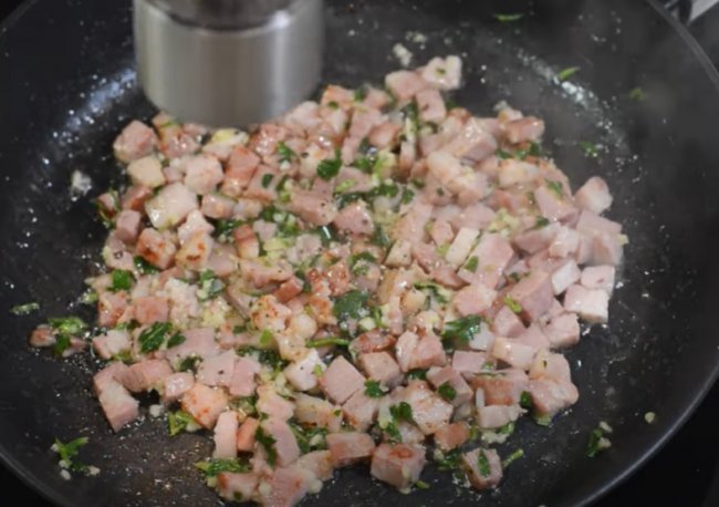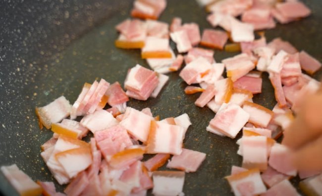 - После выкладываем его на тарелку, а в сковороду отправляем нарезанный небольшими кусочками бекон, жарим на среднем огне 2-3 минуты.
