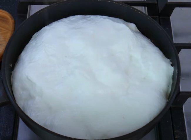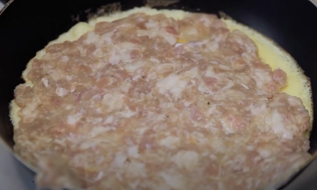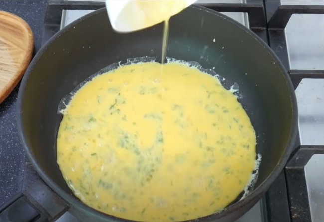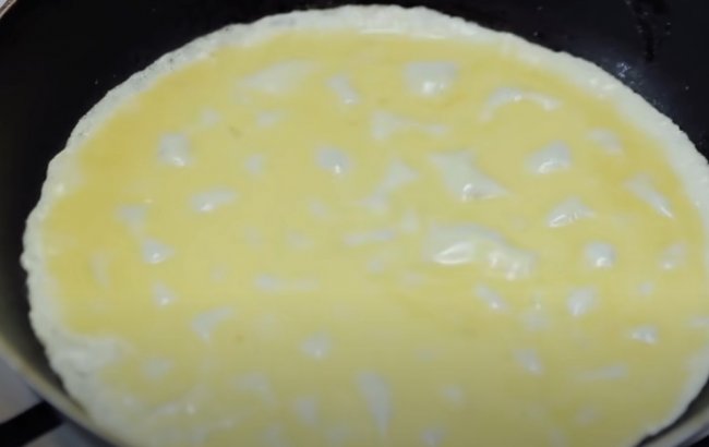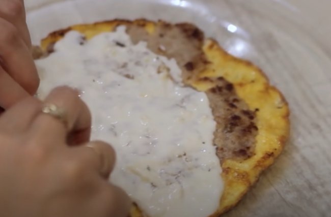 - Сковороду смазываем кокосовым маслом, выливаем на нее смесь из желтков и накрываем крышкой на пару минут.