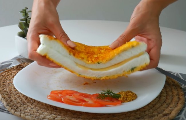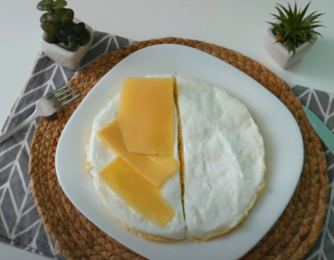 - Готовый омлет разрезаем пополам. На одну половину кладем тонкие ломтики сыра, накрываем второй половиной. Омлет готов, подаем с помидорами.