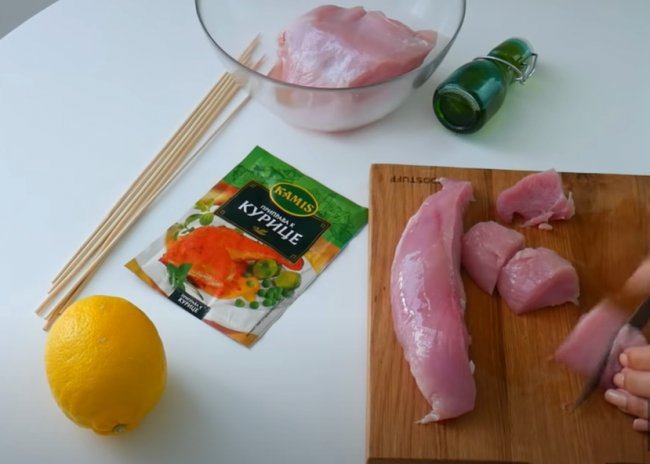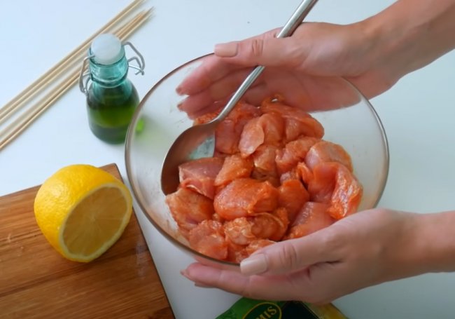 - Кусочки индейки насаживаем на шпажки, а между кусочками добавляем дольки лимона.