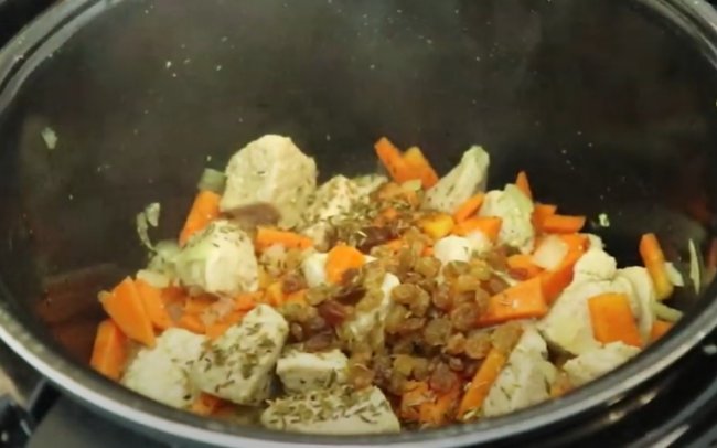 - Готовим блюдо в режиме «Тушение» в течение 1 часа, а затем оставляем на подогреве на 15 минут.