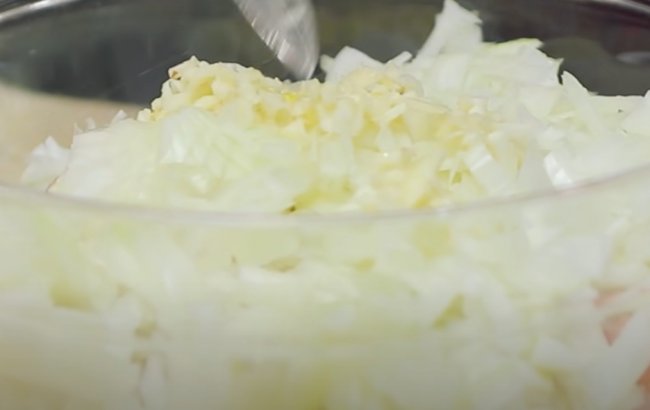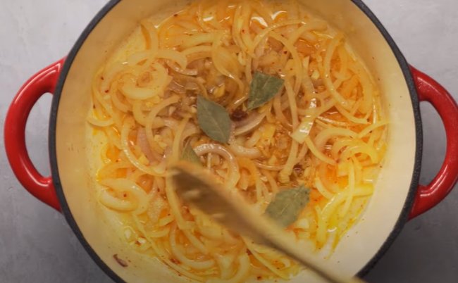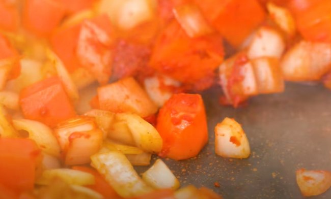 - В сковороду отправляем нашинкованный полукольцами лук вместе с измельченным чесноком, хлопьями перца чили. Также всыпаем соль и обжариваем овощ в течение 3-4 минут.