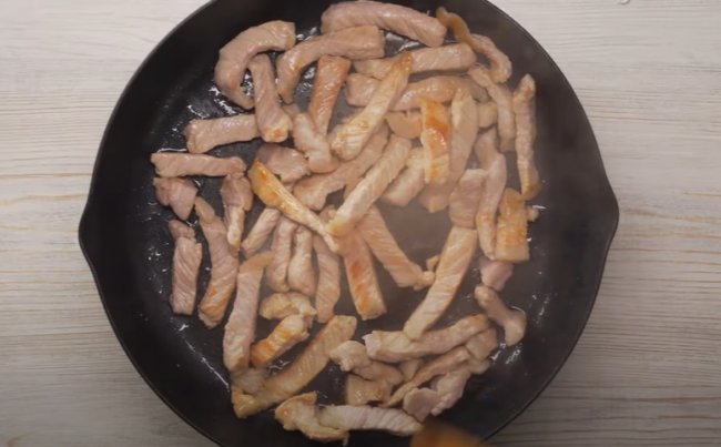 - Свинину нарезаем соломкой и на разогретой с маслом сковороде обжариваем мясо на сильном огне в течение 3-4 минут.