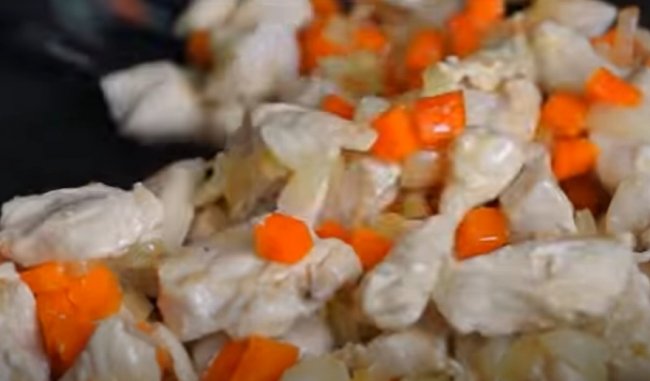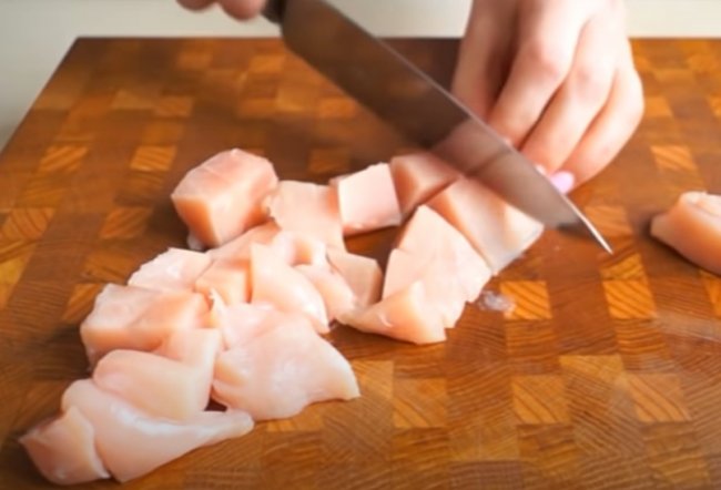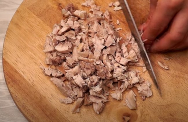 - Филе индейки предварительно отвариваем, а затем просто нарезаем небольшими кубиками.