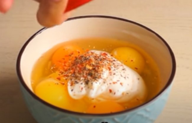- Начнем с того, что отделяем белки от желтков. В мисочку с желтками добавляем измельченную зелень, соль, вливаем молоко и взбалтываем обычной вилкой до однородности.