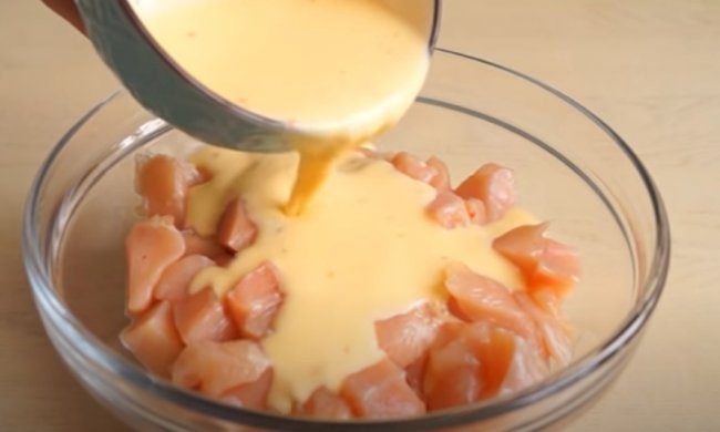 - Небольшими кусочками нарезаем филе индейки и помещаем их в глубокую миску.