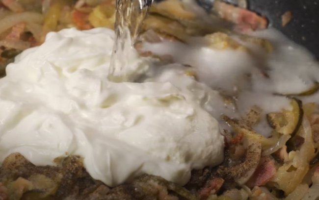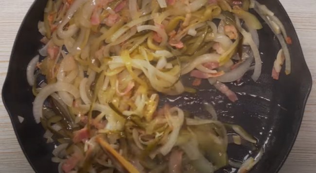 - Затем к бекону добавляем нашинкованный полукольцами лук и соленые огурцы, которые режем тонкой соломкой, обжариваем в течение 4 минут.