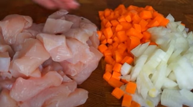 - Небольшими кубиками режем лук и морковь.
