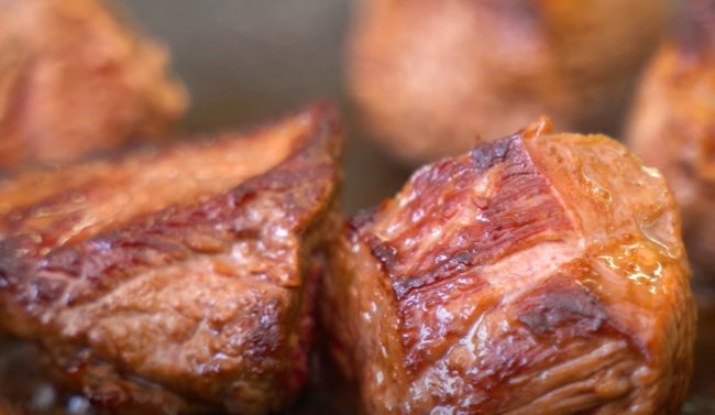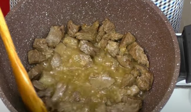 - Свинину нарезаем довольно крупными кусочками и на растительном масле обжариваем в течение 15 минут с каждой стороны до румяности.