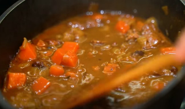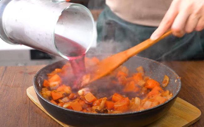 - Теперь вливаем воду или овощной бульон, аккуратно перемешиваем и после закипания томим под крышкой 40-45 минут.