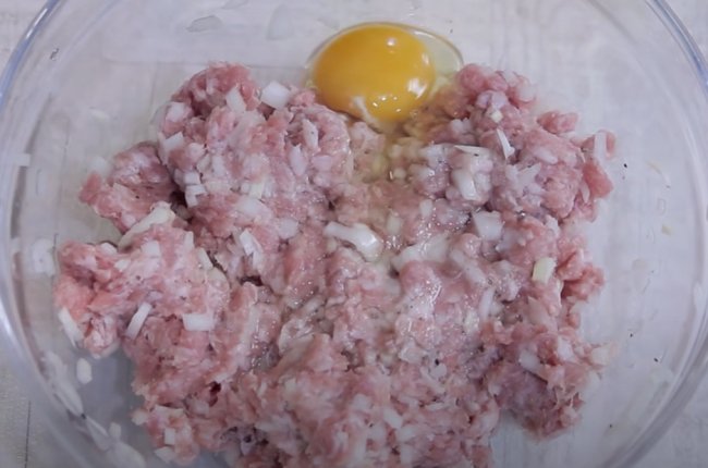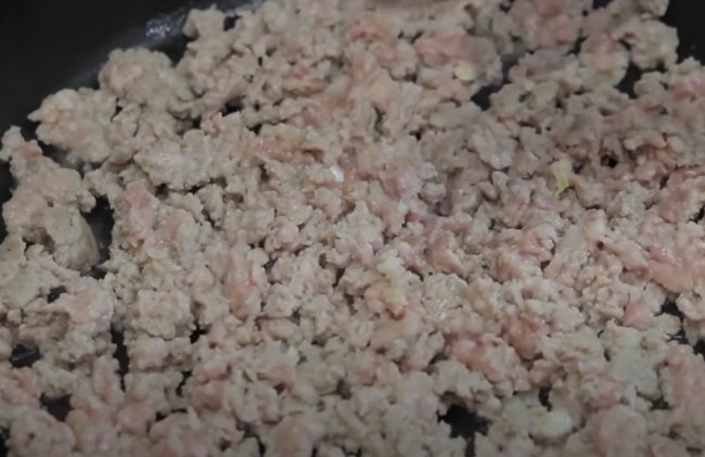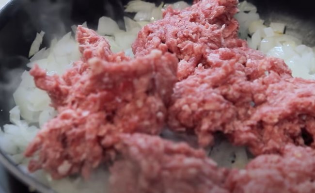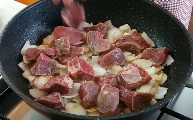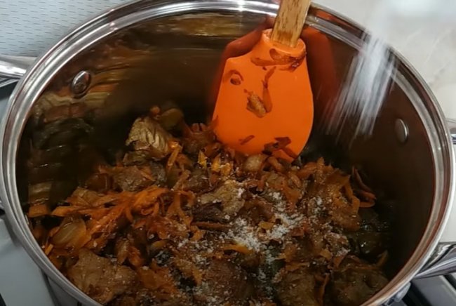 - Затем мясо солим, перчим, добавляем любые специи по вкусу, мелко нарезанный лук и тертую морковь. Перешиваем и жарим 3 минуты.