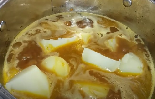 - Затем подсыпаем сахар, вливаем кокосовое молоко, ждем закипания и тушим 1 час.