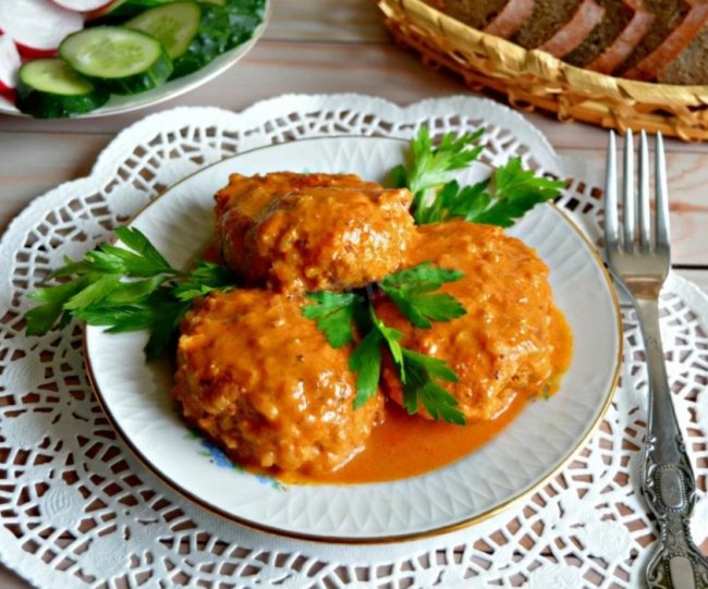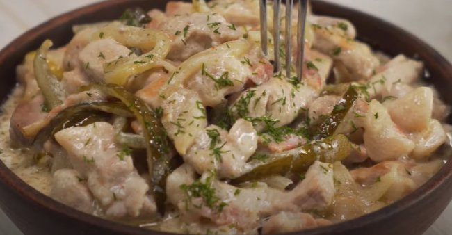 Курземес – это фирменное блюдо, которое готовят в Латвии. Кусочки свинины вначале обжаривают, а затем тушат в сметанном соусе с луком и солеными огурчиками. Получается очень вкусно.