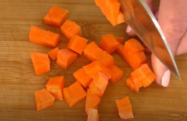 - Полукружочками шинкуем морковь и малыми кубиками лук.