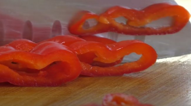 - Полукольцами шинкуем лук, мелко крошим чеснок, острый красный перец нарезаем тонкими колечками.