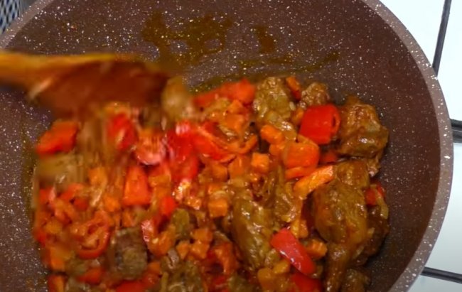 - Мясо солим, перчим, добавляем к нему овощи и жарим 5 минут.