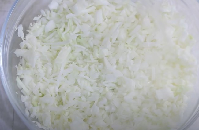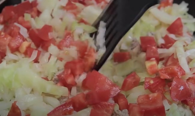 - После закладываем нарезанную небольшими кусочками капусту, готовим еще 3 минуты.