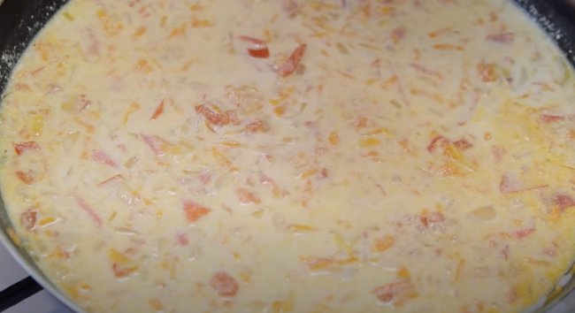 - Затем сверху выкладываем взбитые белки и осторожно распределяем их по всей сковороде. Готовим под крышкой еще пару минут.