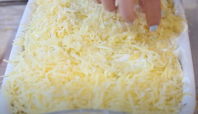 - За 5 минут до готовности посыпаем тертым сыром. Запеканку подаем с нежирной сметаной и зеленью.
