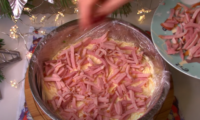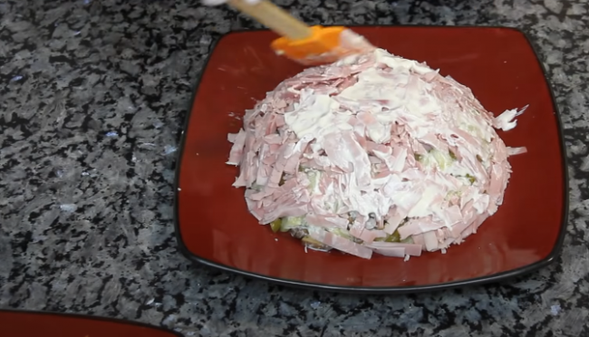 - Теперь берем ветчину, нарезаем ее соломкой, выкладываем поверх сыра и смазываем майонезом.