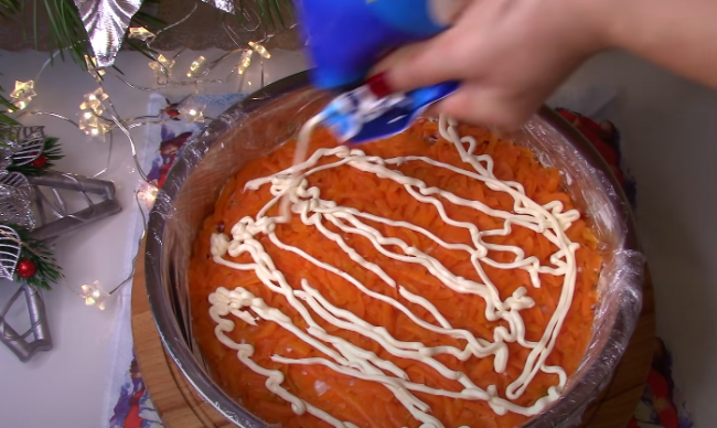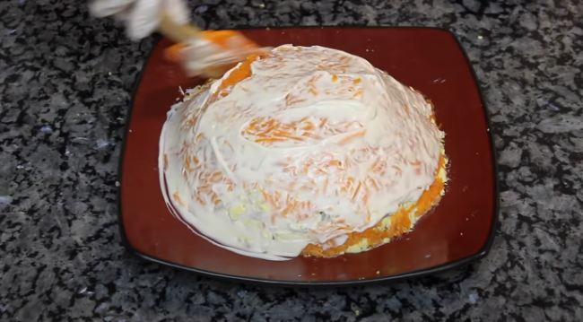 - Затем желтки и морковь, немного солим, перчим, также промазываем каждый слой соусом.
