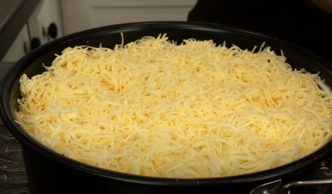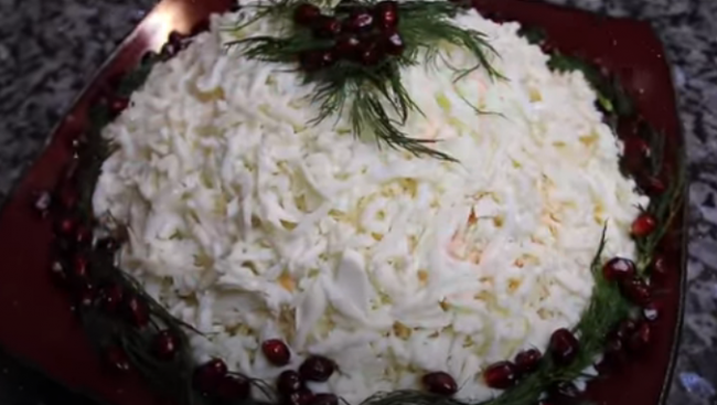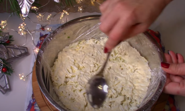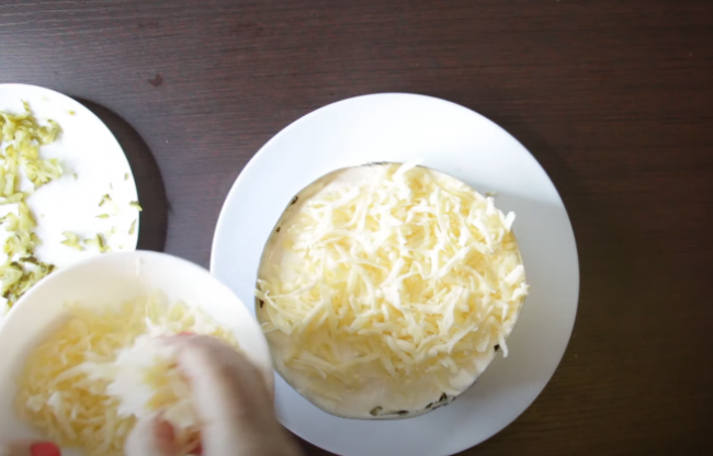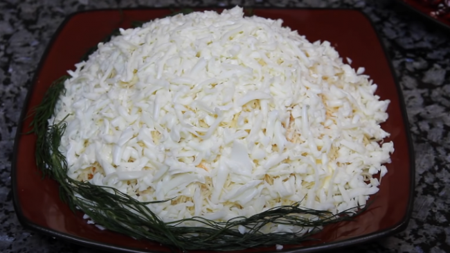 - Далее слой из тертого сыра плюс майонез, и последний слой – яичные белки.