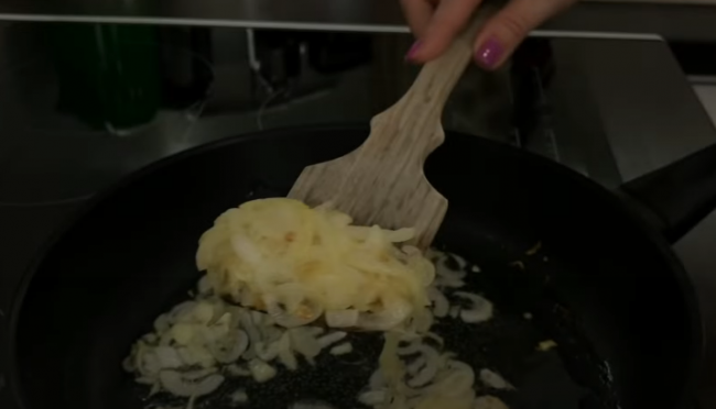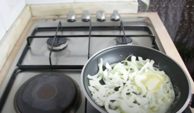 - Тонкими полукольцами измельчаем лук и слегка пассеруем на сковороде с добавлением сливочного масла.