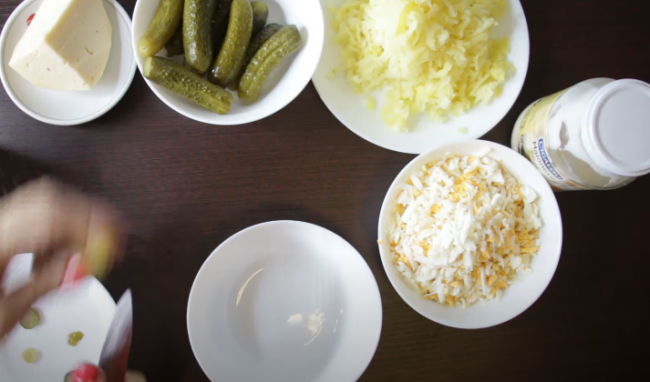 - С помощью крупной терки делаем нарезку из картофеля, яиц и соленых огурцов.