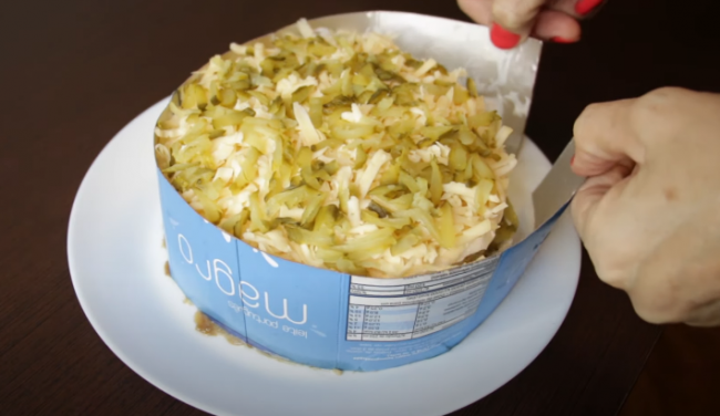 - На мясной слой натираем соленые огурцы, распределяем, а сверху выкладываем жареный лук.