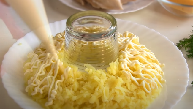 - Салат будет в форме кольца, поэтому в центр блюда сразу ставим стакан. Вареный картофель натираем на крупной терке, выкладываем, аккуратно распределяем, немного солим и смазываем майонезом.