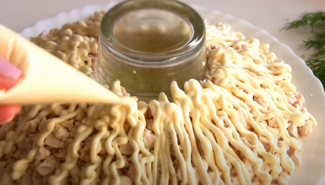 - Куриное мясо предварительно отвариваем, мелко нарезаем, выкладываем следующим слоем и сверху наносим сеточку из майонеза.