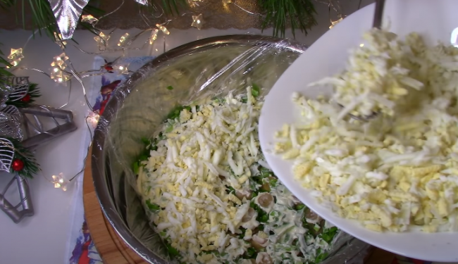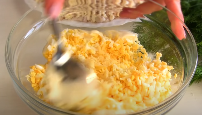 - На крупной терке натираем вареные яйца, делаем из них следующий слой и промазываем майонезом.