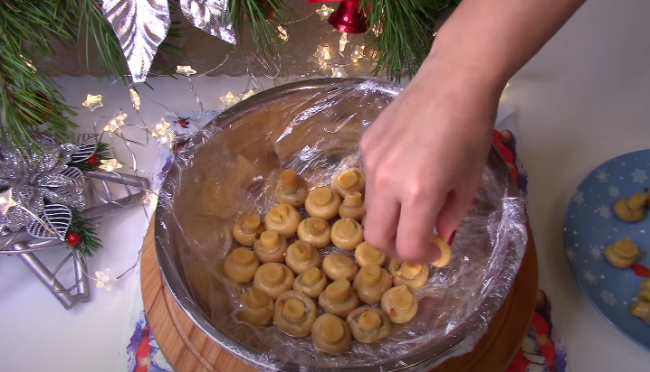 - Глубокую емкость полностью застилаем пищевой пленкой и первым слоем выкладываем маринованные шампиньоны шляпками вниз.
