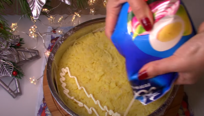 - На блюдо для подачи салата на крупной терке измельчаем картофель, солим, перчим и смазываем майонезом.