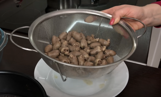 - Куриные сердечки отвариваем в подсоленной воде до готовности, полностью остужаем.