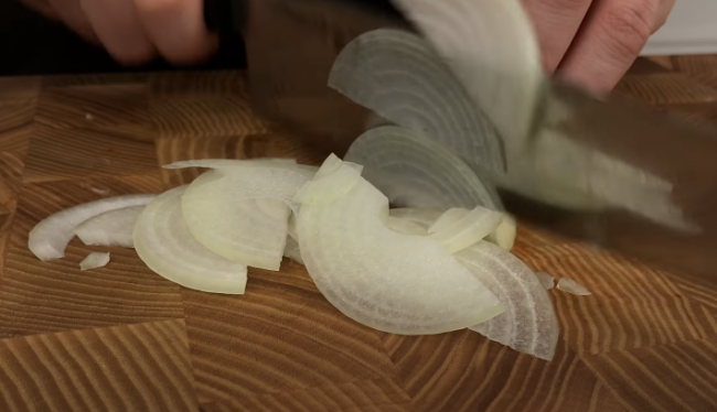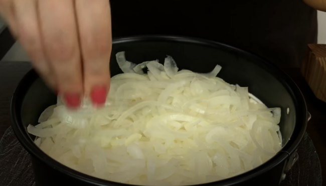 - Лук шинкуем тонкими полукольцами, перекладываем в миску, заливаем кипятком и оставляем до того момента, пока вода полностью не остынет.