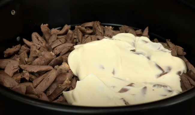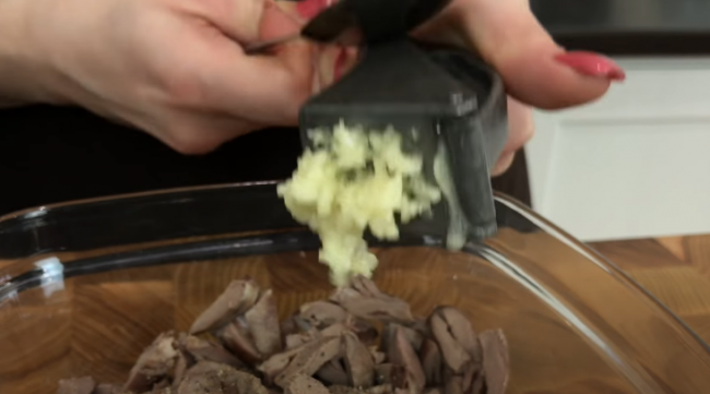- Остывшие куриные сердечки нарезаем более мелкими кусочками, посыпаем перцем, добавляем тертый чеснок и перемешиваем.