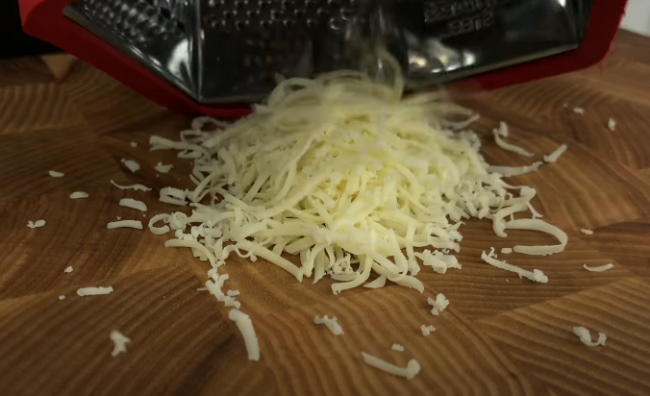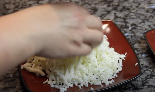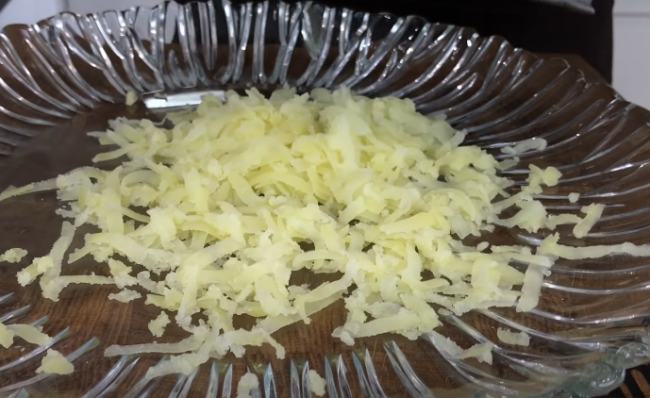 - Яйца измельчаем с помощью терки (белки отдельно от желтков).