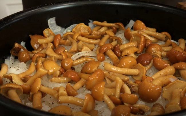- Шампиньоны с луком солим, перчим и обжариваем 10 минут.