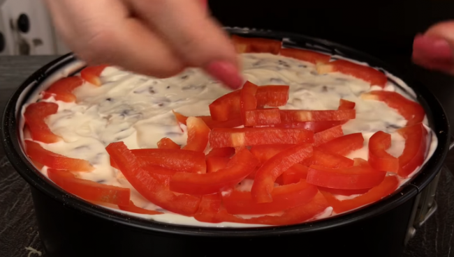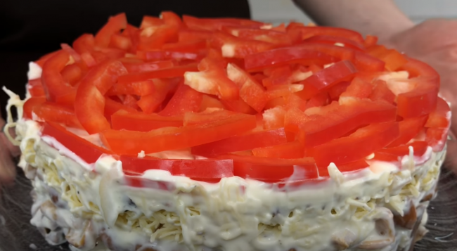 - По всей поверхности салата красивой стороной выкладываем сладкий перец и убираем блюдо в прохладное место.