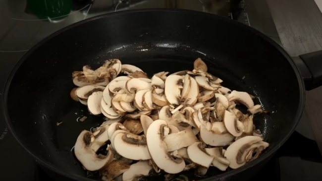 - В этом же масле обжариваем нарезанные тонкими пластинами шампиньоны до готовности. В процессе грибочки солим и при желании перчим.